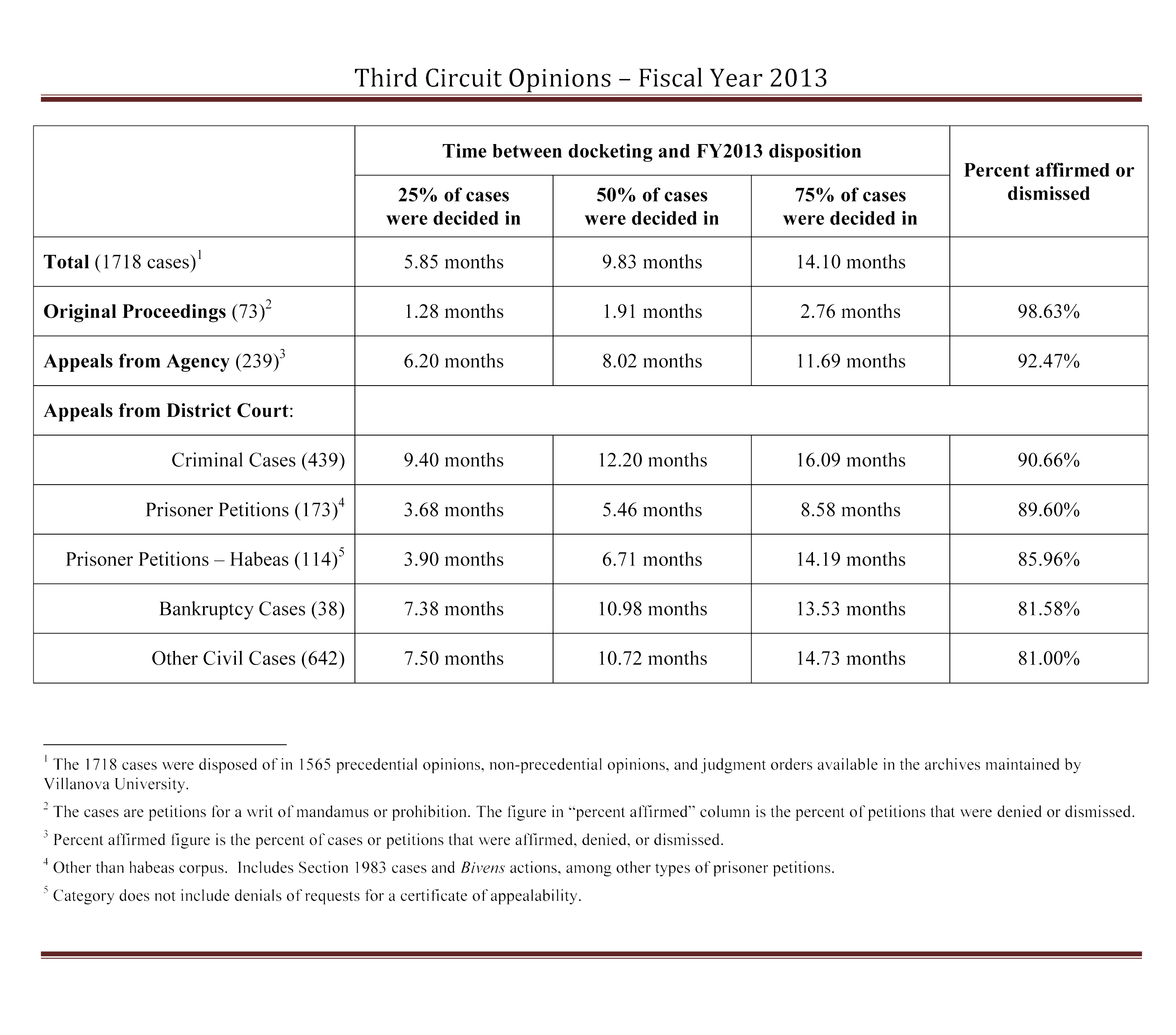 Here are some basic statistics on the Third Circuit’s decisions in FY 2013 (October 1, 2012 to September 30, 2013). Note that the percent affirmed or dismissed figures vary by case type, and range from 81% (other civil cases) to 92.47% (appeals from administrative agencies). Thus, for example, in just over 90% of criminal cases, the Third Circuit left the district court’s decision untouched. On the other hand, in just under 10% of those cases, the district court’s judgment was reversed, reversed in part, vacated, or vacated in part. The figures also show that nearly all petitions for writs of mandamus or prohibition are denied or dismissed.