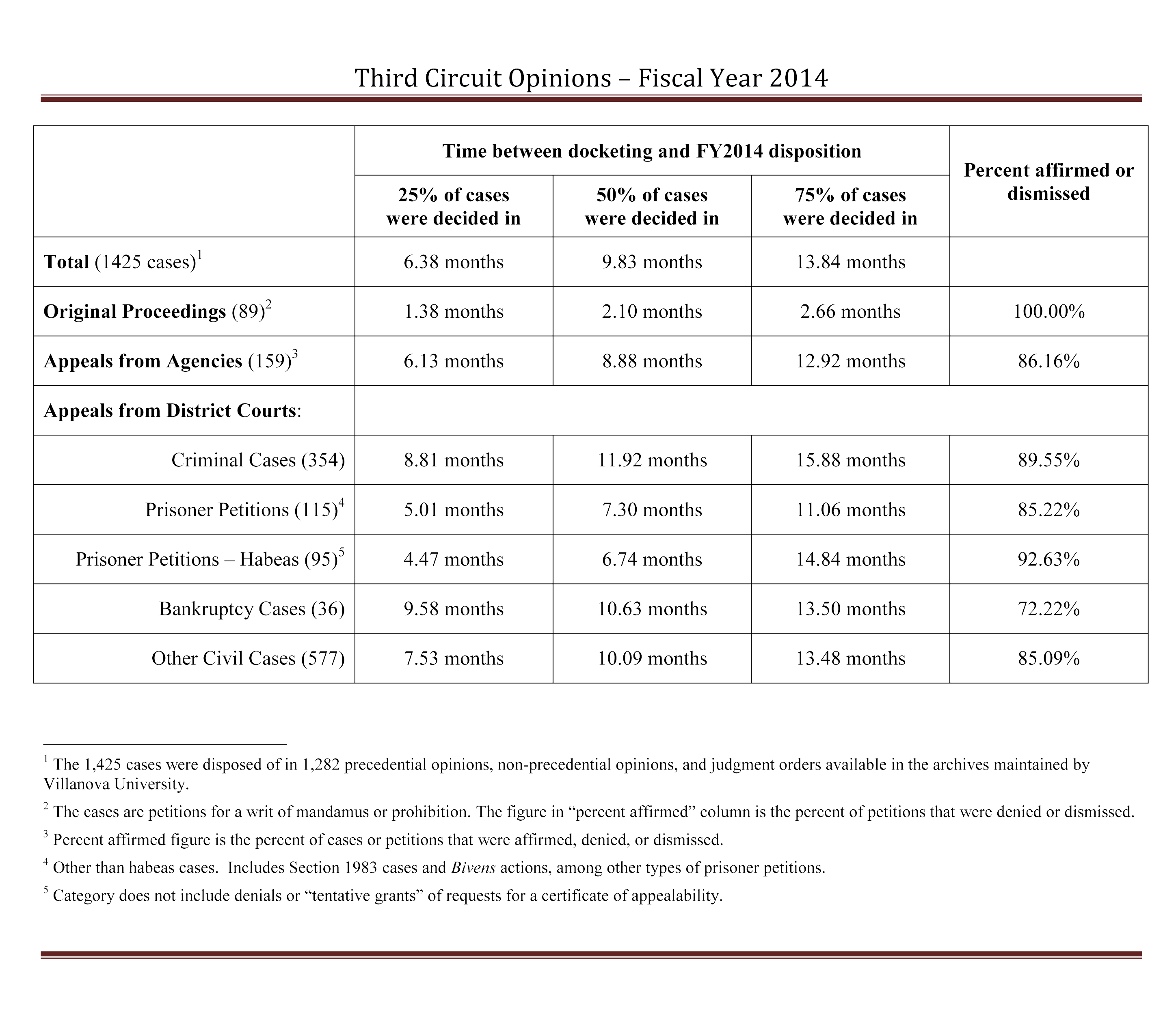 I finally have some basic statistics for FY 2014 (October 1, 2013 to September 30, 2014).  As before, the “cases” in the table below are appeals and petitions decided by the Third Circuit, with every unique docket number being treated as a case.  To enlarge the table, just click on it.